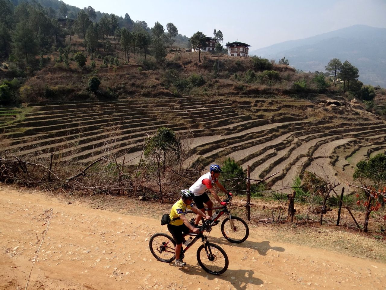 Of course cycling in mountainous landscapes is not for everyone. You do need to be bike fit, and the thinner air can leave you short of breath. We did encounter some difficult road surfaces, and we did some off-roading, too, particularly on a section high above former capital Punakha, on a switchback trail covered in pine needles. From this height the big metal roofs of the Bhutanese houses made them look like tin tacks pressed into the valley walls.