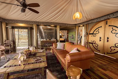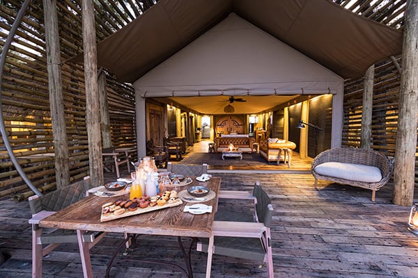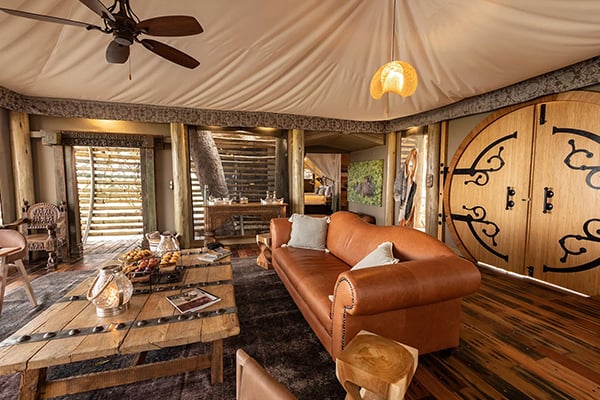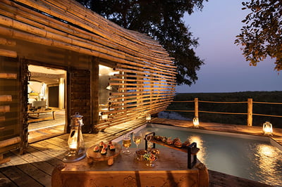 Built on a raised, wrap-around railway sleeper private deck using entirely recycled materials, Sitatunga Private Island can accommodate up to eight guests as part of Great Plains' latest Okavango Delta water-based Réserve-Collection Safari Camp. Sitatunga's design encapsulates the Okavango's story, a water-surrounded camp reminiscent of Robinson Crusoe and a historical haven for indigenous fishermen for over 200 years. Drawing inspiration from their traditional fishing baskets and traps, Dereck Joubert designed rooms resembling tents suspended within large bamboo fisherman baskets. When admiring the landscape, the interiors reflect the Okavango's palette, showcasing misty greens and light-bleached woods.