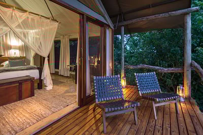 Comprising five tents built on raised wooden platforms, each with a private front deck offering picturesque vistas of the floodplains, Tubu Tree Camp sleeps up to a maximum of 10 guests. Each tent has an en suite bathroom as well as a private outdoor shower, and there's also one family tent and one honeymoon tent.