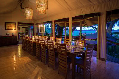 The main dining and lounge areas are large, elegantly decorated tents also on raised platforms and built amongst the trees with views over the Okavango Delta floodplains.