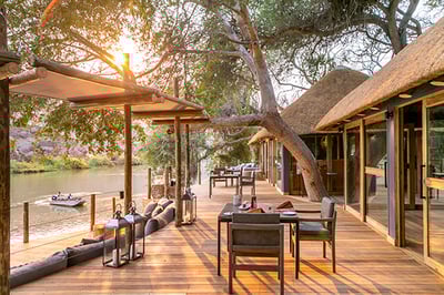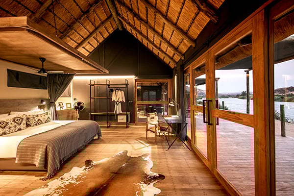 Accommodation at Serra Cafema consists of eight riverside Meru-style canvas and thatched chalets on spacious, elevated decks. Each fully furnished tent has an en suite bathroom, ceiling fan and mosquito nets. Late afternoon spent lounging on the front deck soaking up the vistas of this contrasting wilderness is a must.