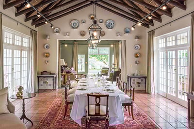 “Prepare to be welcomed by a tranquil setting in a vineyard and plum orchard framed by rugged mountains in Franschhoek, less than an hour’s drive from Cape Town. This privately owned complex was first established by French Huguenots in 1692 and today offers distinguished heritage, ambience, space and luxury for couples, families and friends. Take note: the gourmet dinners are divine.”