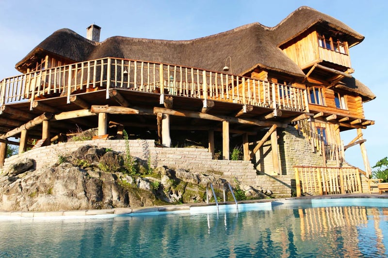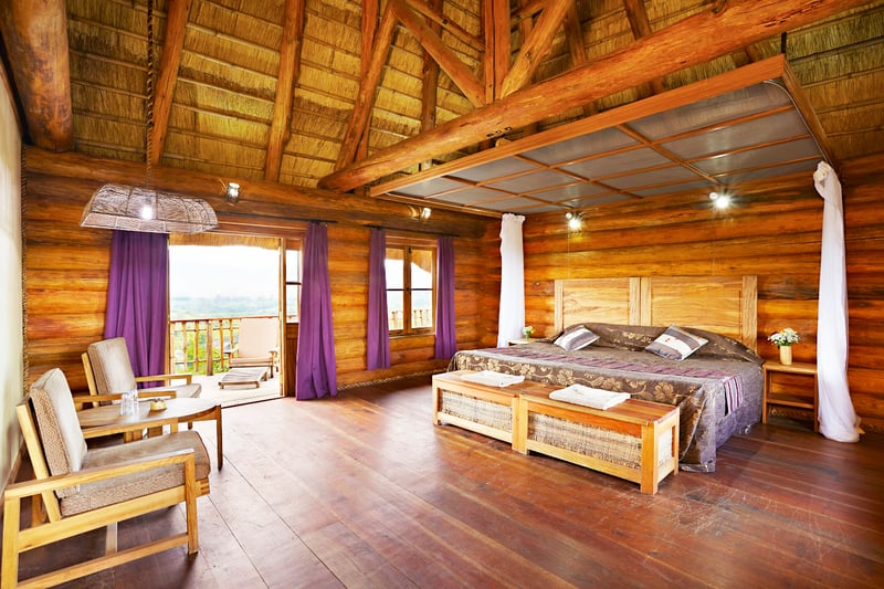 Built from over a thousand hand carved logs, the exceptional design and scale of Kyaninga Lodge in Uganda, Africa provides an extraordinary first impression from the get-go. The main lodge features striking architecture, a comfy lounge, and multiple decks with spectacular views. Guests looking for more adventure can follow the steps down from the pool to the lake surrounded by primeval forest.