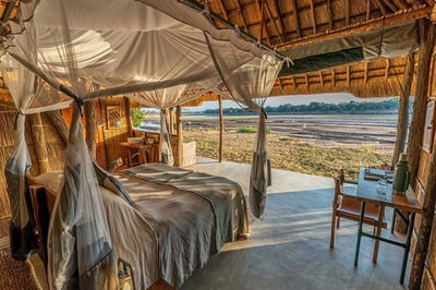 There are four spacious, traditional safari tents under shady thatched roofs, each with an open-air bathroom. All of the tents overlook the river with stunning views up and down this hippo-packed stretch of the Luangwa.
