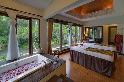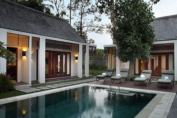 Samaya Ubud's 19 pool villas feature spacious living spaces, state-of-the-art technology, a private lap pool, and a daily picnic basket filled with delicious treats. The Hill View and Hill Side villas offer panoramic views of lush greenery and tropical gardens. The Ayung villa is situated right in front of the Ayung River, which adds to the peacefulness of the surrounding tropical forests. Two and three-bedroom villas offer the ultimate in privacy and lavish comfort with a full-size private pool in addition to exquisite interiors.