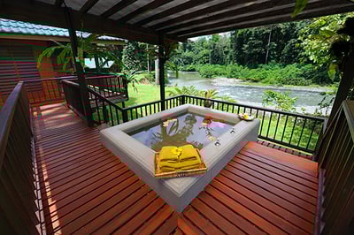 Accommodation is in 30 individual chalets and villas. The eco-friendly structures are minimalistic yet stylish with ceiling fans, en suites with hot showers, and private decks with views of the river and jungle. The deluxe chalets have outdoor tubs, while the premium villas have private plunge pools.