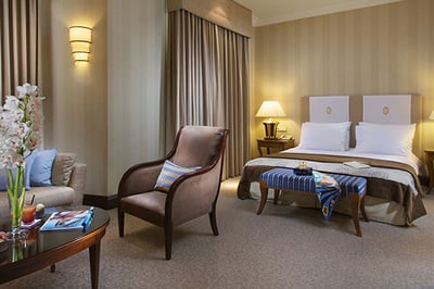 This is a charming hotel with a distinctly old-world feel. The guestrooms and suites ooze glamour with dark wooden furniture, rich fabrics, and marble en suites with walk-in showers and bathtubs. To indulge, we recommend booking the Esplanade Suite with its huge living-dining area, kitchen, Jacuzzi, and sauna.