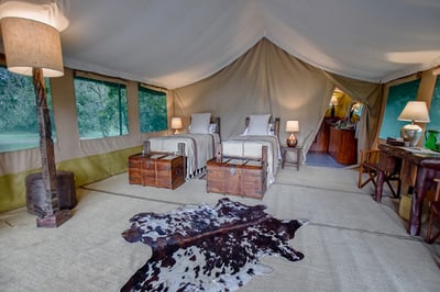 The small and intimate Governors’ Il Moran Camp in Kenya's Maasai Mara comprises 10 spacious and comfortable double-suite tents furnished to superior standards. Each tent comes complete with a Victorian style bath, flush toilet and double basins as well as an extended spacious veranda area, ideal for dining in private.