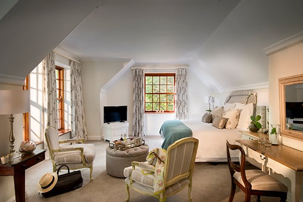 The Cape Dutch-style property houses elegant guestrooms and suites, each with views of the gardens or Table Mountain. The rooms are individually styled, with the main house having a more contemporary vibe and the Hohenort wing featuring traditional Edwardian design. The two villas offer more privacy and Madiba Villa has its own pool.