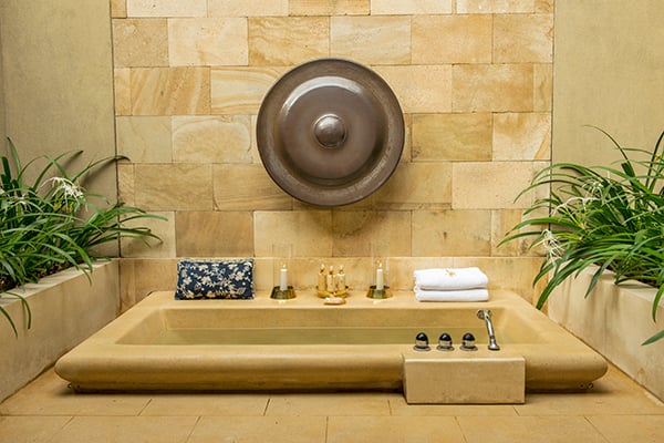 Amnanjiwo’s main building is framed by 36 suites set in two graceful crescents around the central Rotunda. The suites feature terrazzo flooring, high ceilings, domed roofs, and a thatched pavilion with a daybed for relaxing. Interiors include a four-poster bed, coconut wood, and rattan furniture, and traditional glass paintings. For the ultimate in luxury, the Dalem Jiwo Suite comes with a private butler and two bedrooms which have steps descending down to a private 15-meter swimming pool.