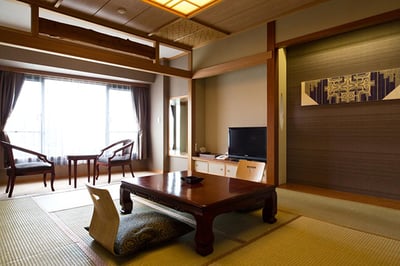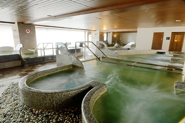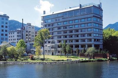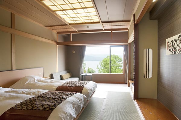 Get your authentic ryokan fix here! Choose between Japanese-style and Western-style rooms, featuring futon bedding or twin beds on tatami mats. The simple rooms have private en suites and large windows overlooking the lake or town - our pick would be the Japanese Style Rooms with sweeping lake views. The indoor and outdoor onsens are very good, with various large tubs and a sauna.
