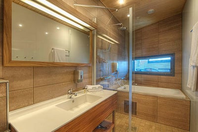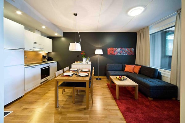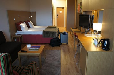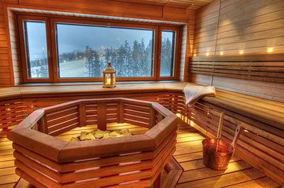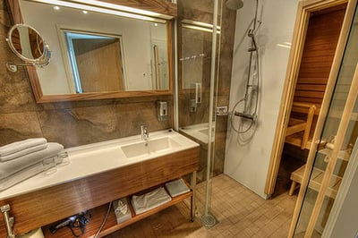 There are six categories of guestrooms and suites decorated in Scandinavian style, with light wooden floors and furniture and bright pops of color. Some rooms offer saunas or baths and have balconies overlooking the forest and ski slopes.