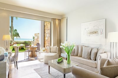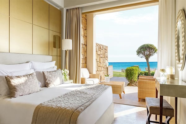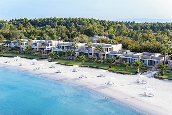 Sani Asterias is the boutique offering on the Sani Resort, with generous sized newly refurbished suites throughout. We highly recommend the Family Deluxe Suite, with two bedrooms, two luxurious marbled bathrooms, a living space, and a garden. We’re fans of the exclusive white sandy beach and gorgeous heated pool here. Make sure your Travel Designer reserves for dinner for you at the gourmet Water Restaurant, winner of the coveted Greek Golden Hat award.