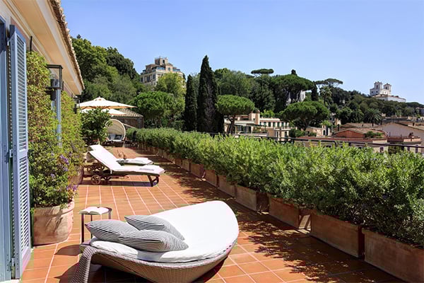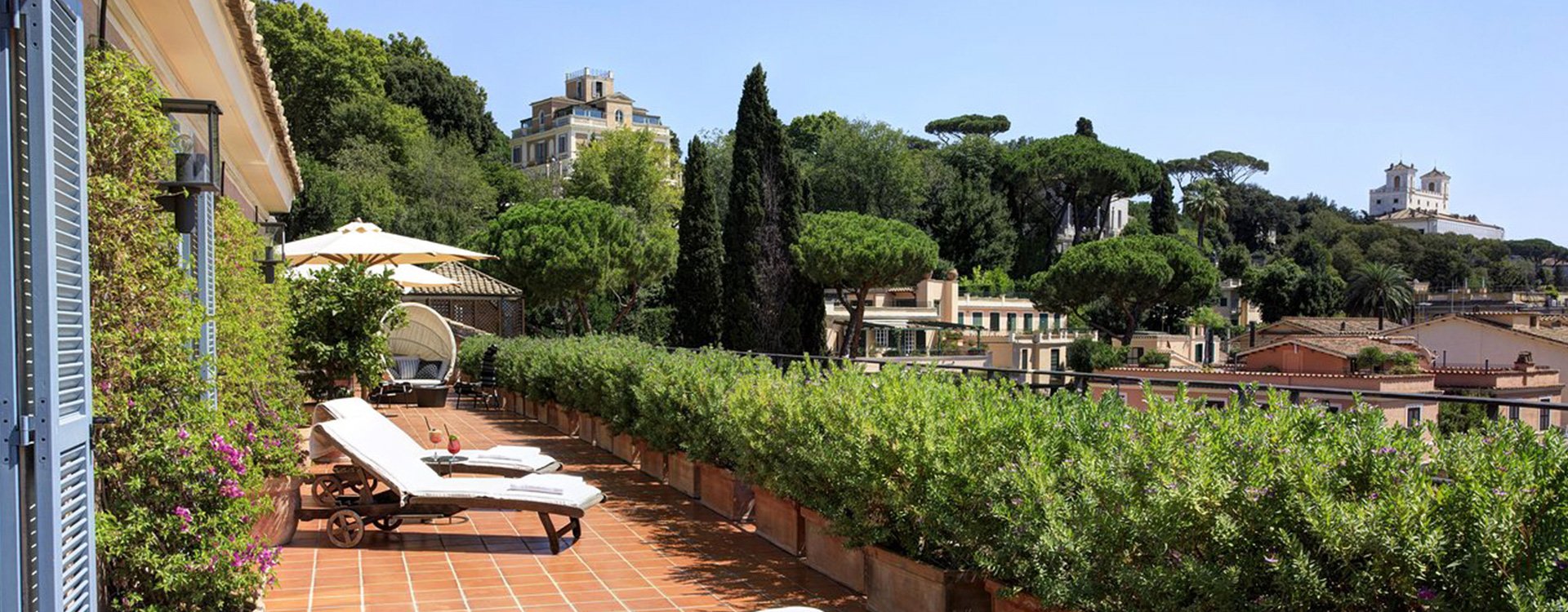 There are 122 rooms, including 33 suites, four of which have their own private terraces. Many rooms have views either of the hotel’s gardens or the Piazza del Popolo.