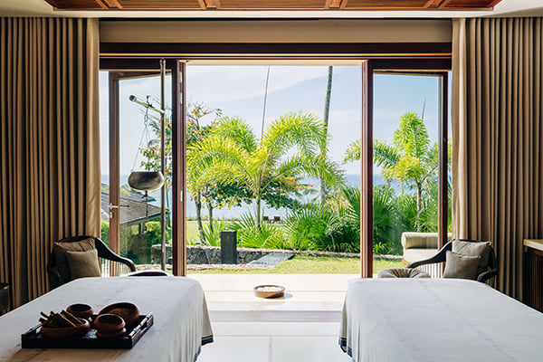 Spanning two levels to maximize ocean or garden vistas, each of eight Split-Level Suites boasts a spacious private terrace with twin daybeds for outdoor lounging. Four out of the eight suites include private plunge pools. Inside, beneath high woven bamboo ceilings, you'll find a king-size bed adjacent to an open sitting area, while the generous bathroom offers double sinks, an eye-catching circular bathtub, and a rainfall shower. A seamless ramp addition makes these Suites suitable for guests with accessibility needs.