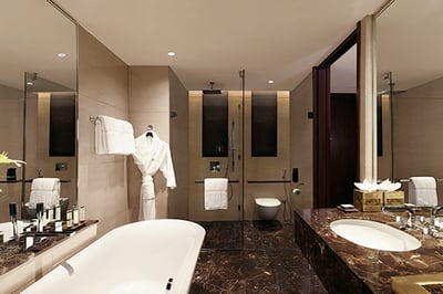 The guestrooms and suites have a contemporary elegance with polished wooden floors, plush textiles, modern technology, and floor-to-ceiling soundproof windows looking over the airport runways. The suites include separate living spaces, kitchenettes and larger en suites.