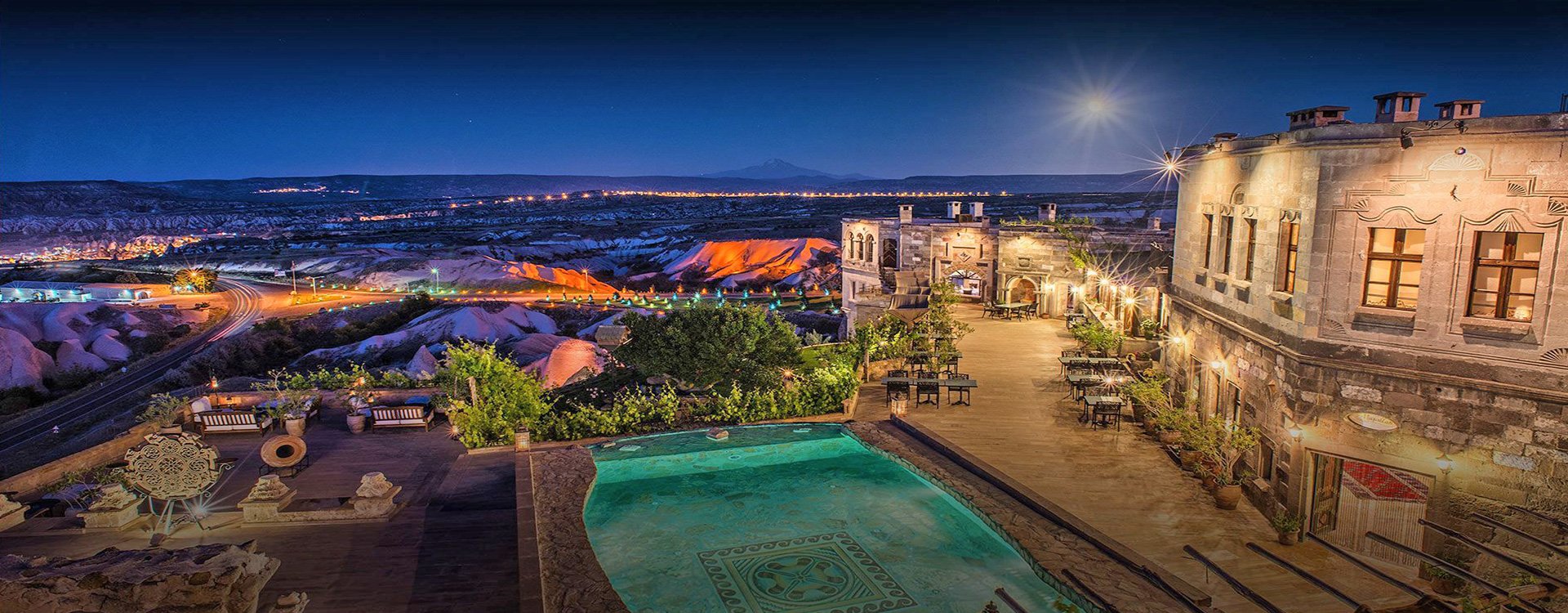 With a total of 30 unique rooms and suites, each room is located in its own unique cave-liked interior and decorated with priceless antiques, that provide a magnificent view of the Pigeon Valley, White Valley, Red Valley and Goreme, with the splendid Mt. Eric’s stretching away in the distance. Each room has a Jacuzzi with the breath taking views surrounded by a natural and historical view and ambience.