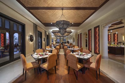 This luxury resort is nestled amid rolling sand dunes in the Liwa Desert. Boasting an Arabian fort-style design, it features opulent décor, palm-lined courtyards and sparkling fountains. As night falls, twinkling Arabic lanterns dotted around the resort give it a magical ambience.