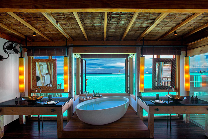 The first thing that you need to do is kick off your heels – it is a barefoot luxury retreat after all. But what happens next is up to you. You might want to relax on your overwater terrace, take a dip in your free-standing tub with a view of the ocean, or enjoy a swim in your private underwater walled garden, which you reach when you descend the steps of your two-storey villa. Where to sleep also comes with multiple options, as you can relax in your airconditioned bedroom or you can take the stairs to your rooftop terrace and sleep under the stars. Bliss…