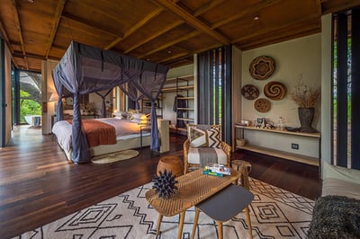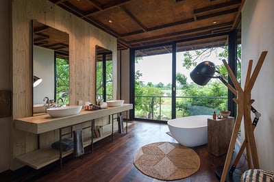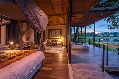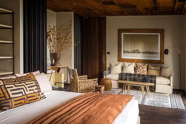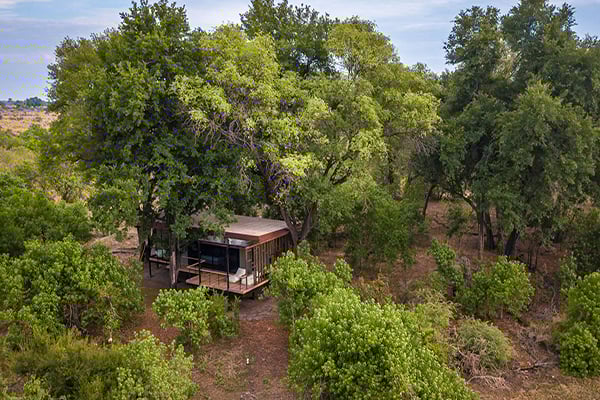 The camp houses eight classic tented suites and one exclusive family suite with a splash pool in an expanse of over 60,000 stunning acres. With beige-brown tones and Botswana wood materials, the suites blend African safari design with all mod cons. There’s also a convertible indoor-outdoor shower in each tented suite.