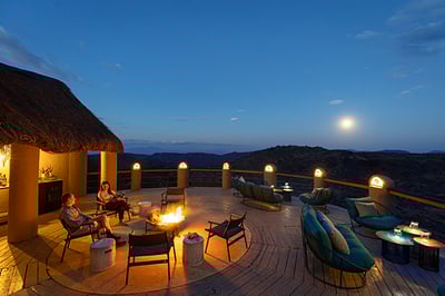 Finally, Carissa is hidden on the property's highest point, with breathtaking 280 views of Laikipia's rugged landscape. The bedroom comes with a round bed and floor-to-ceiling windows. There is a sunken outdoor bathtub in the rocks, often with eagles flying above you, a lounge with a fireplace, a dining room, and a large wrap-around terrace. The villa's gorgeous interiors are inspired by the carissa tree, and feature pops of green and blue.