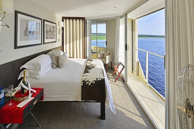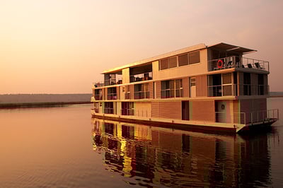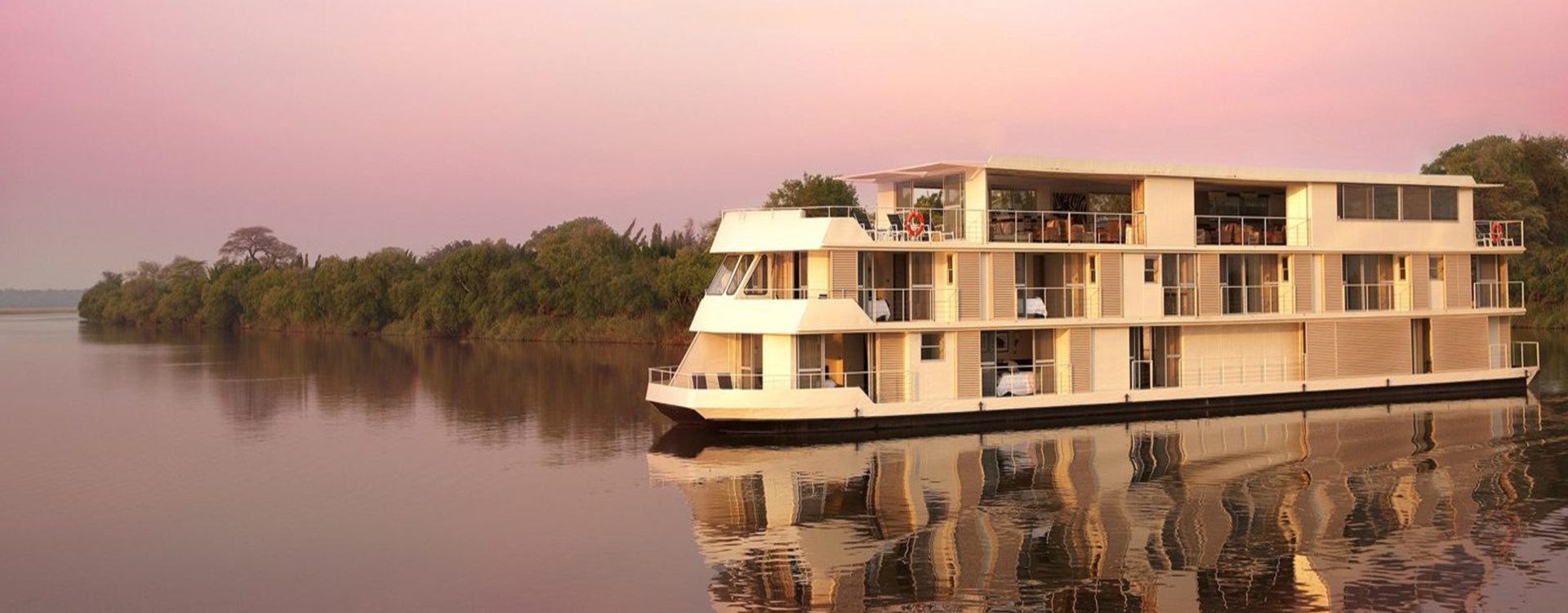 Accessed by a 30-minute charter flight from Africa's Victoria Falls to Impillia Island in Namibia, followed by a ten-minute boat ride, the Zambezi Queen is a 28-passenger, all-suite, eco-friendly river cruise ship featuring three luxuriously furnished levels. From here, it cruises through the untamed waters of the Chobe River which dissects Botswana, Namibia, Zimbabwe and Zambia.
