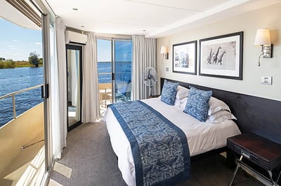 This craft accommodates 14 tastefully designed cabins—including four master suites - and is fitted with private balconies and mozzie-net-protected panoramic sliding glass windows, ideal for game viewing.