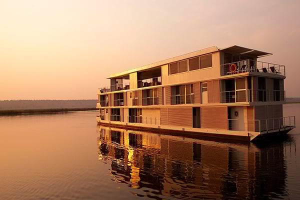 The houseboat also has a top-deck whirlpool where you can kick back and watch for hippos, buffalo herds, lion pride, elephants, or the rare puku antelope in the Namibian floodplains of the Chobe River. Two game-viewing boats also afford close-up water-based game viewing in an environment where the animals do not feel threatened.