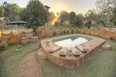 There's a spacious dining area, and the communal areas feature plenty of seating with plush cushions. The sandy campfire next to the river is perfect for starry night skies. There is also a swimming pool.