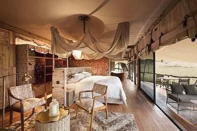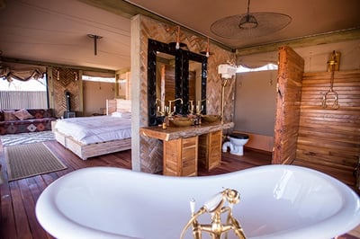 Somalisa Acacia can accommodate a maximum of eight guests across four tents, which include two family tents featuring inter-leading walkways between the parents' and children's rooms. Each tent has gauze sliding doors, a glass wood burner, dark teak furniture, and an en suite bathroom with both indoor and outdoor shower facilities.