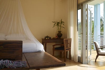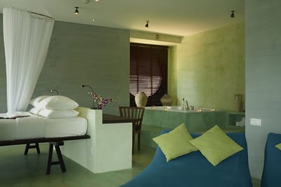 Its 18 rooms and suites are charmingly rustic with options for terraces, patios, and sea views. Spacious interiors feature teakwood beds, muted lighting, and antique ceramics while en suites are fitted with natural stone and free-standing tubs.