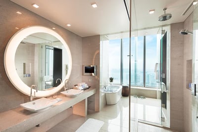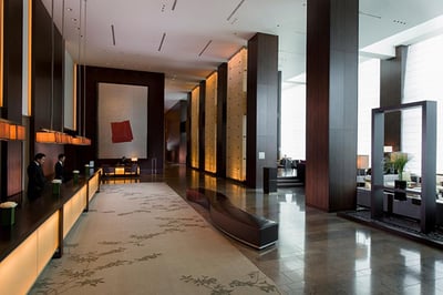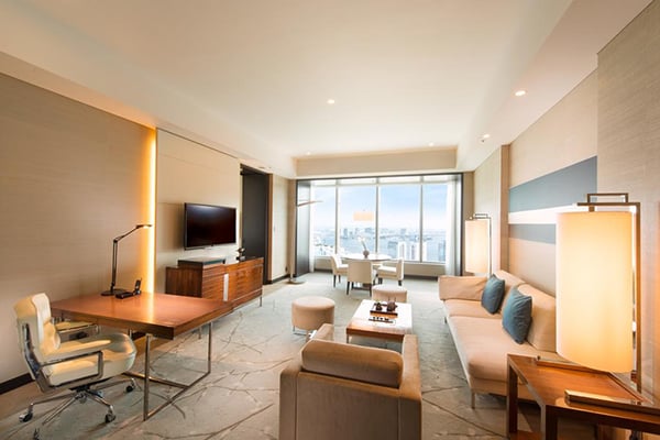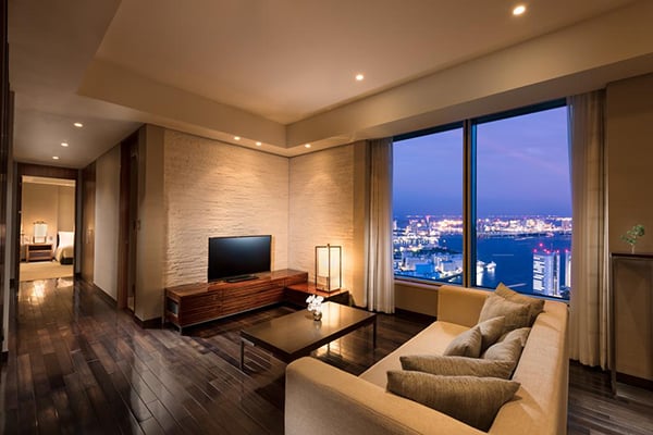 The 290 guestrooms and suites are infused with Japanese minimalism, with polished wooden furniture, neutral earthy tones, and nature motifs including cherry blossom and birds. The modern bathrooms have glass partitions so you can see the city views while reclining in the bathtub.