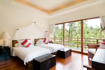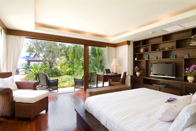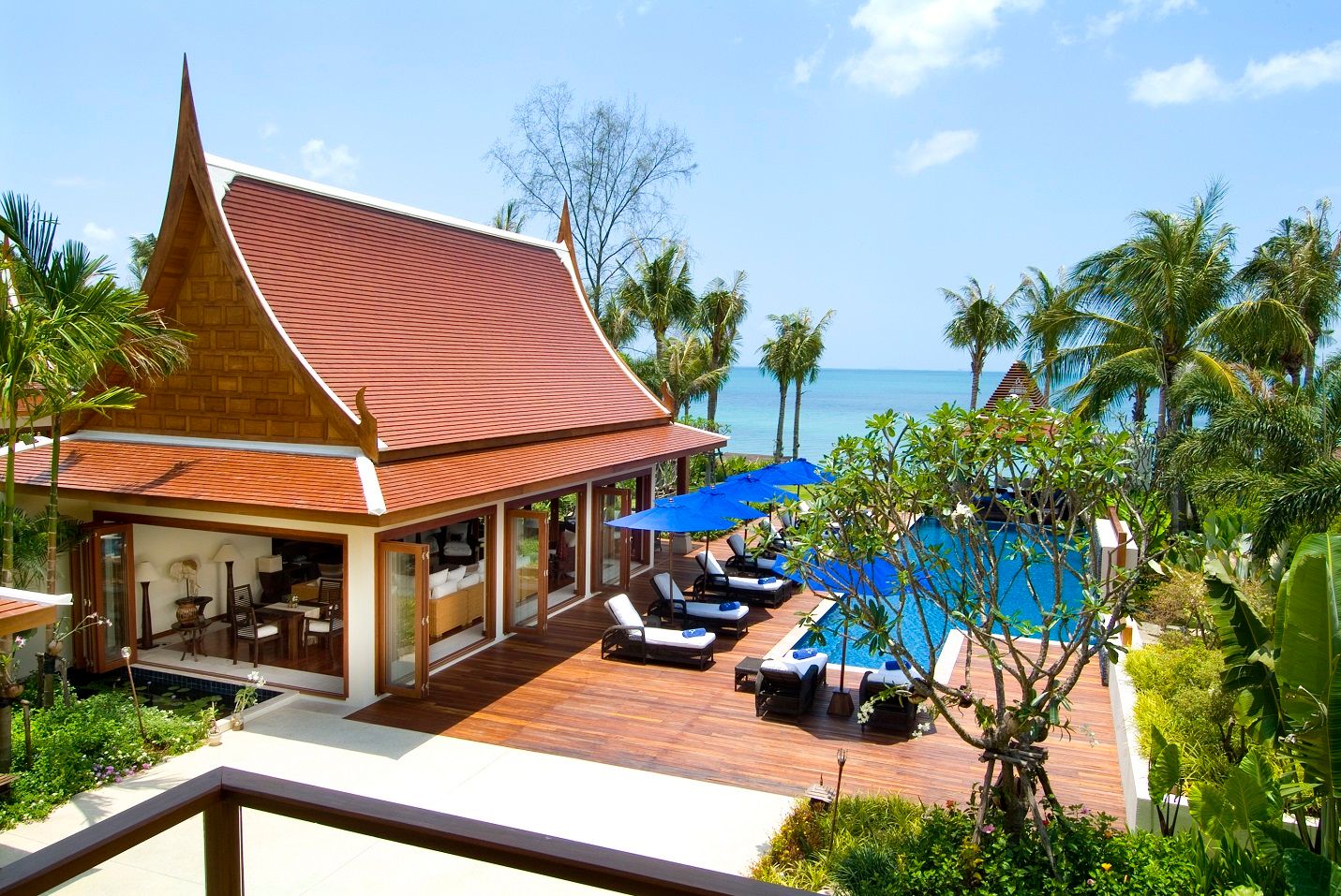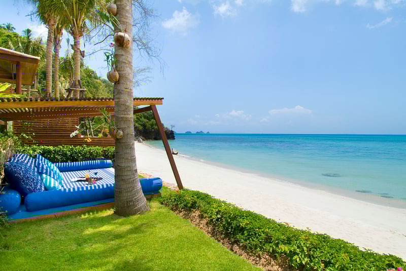 This traditional, Thai-style property comprises five sumptuous bedrooms with en suite bathrooms housed under two pavilions. In the living room there are plenty of couches to curl up on, or you can enjoy a chess-challenge at the games table. Little touches add to the homely feel: flower arrangements, blossoms resting on pillows and shells neatly arranged around the water feature are a nice touch. Larger parties can also take the villa next door, Baan Samlarn, which is ideal for two families or groups of friends.
