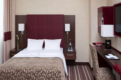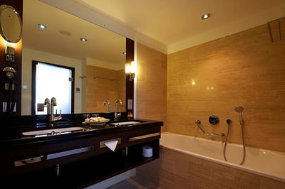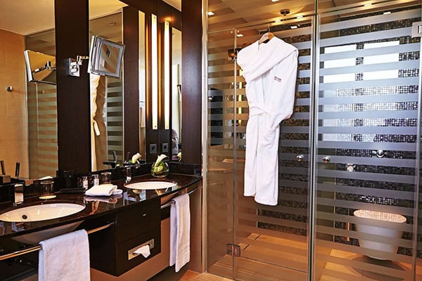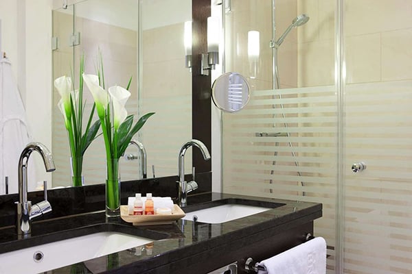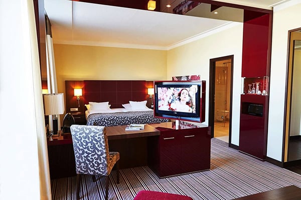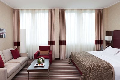 The guestrooms and suites are spacious with high-quality textiles, cheerful color schemes, and relaxing seating areas. The suites offer separate living spaces and larger bathrooms with bathtubs, while the Presidential Suite has a kitchenette plus a private whirlpool and sauna.