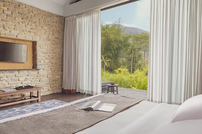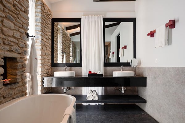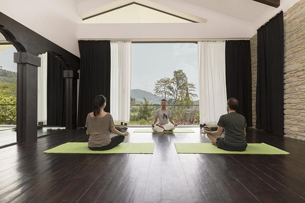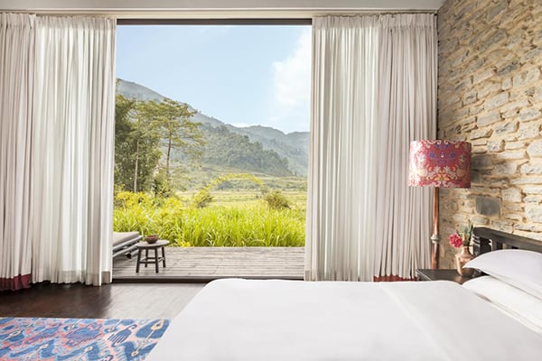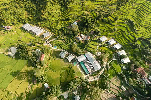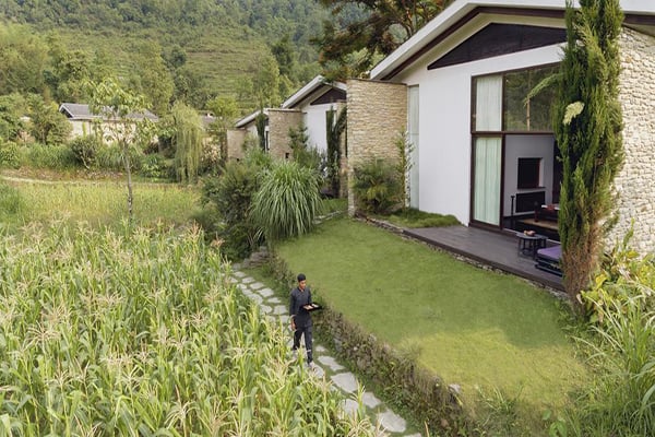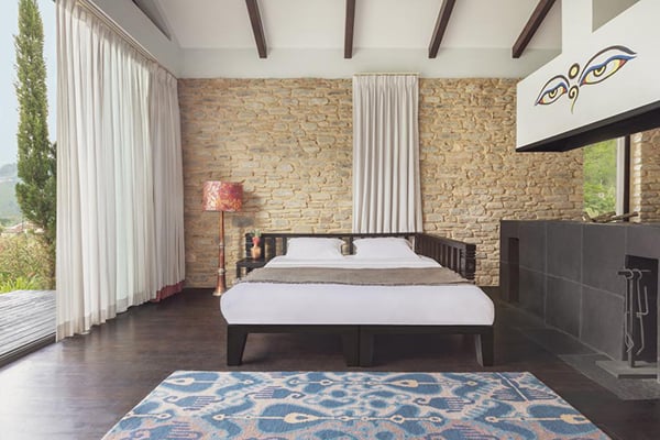 Here, 14 villas are divided into three grades with the main difference being the size. All get a private terrace, Himalayan views, shower and tub in the bathroom, Nepalese textiles and artworks, and a real fireplace. All are powered by solar and renewable energy.