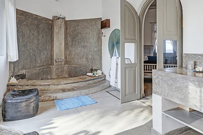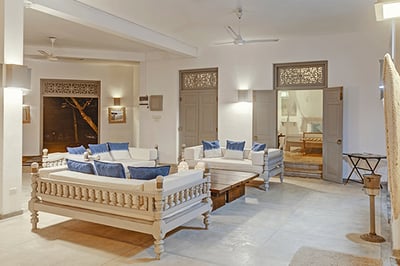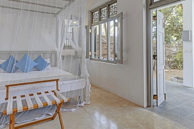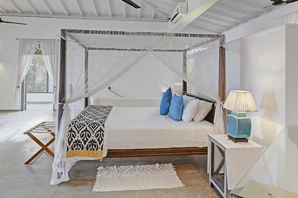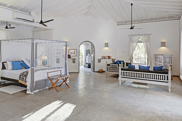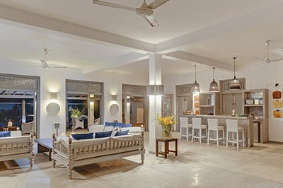 Comprised of two large en-suite bedrooms and one twin room (perfect for young children as it connects to the main bedroom), The Beach Hut is gorgeously finished with traditional Sri Lankan artwork, stone floors, and handmade colorful sofas. The open plan living area and the modern kitchen both overlook the private pool and gardens that stretch all the way down to the beach.