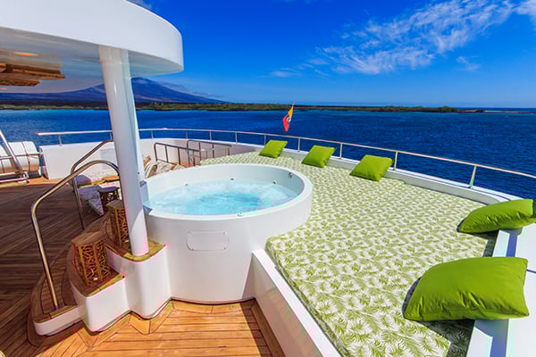 Experience the mesmerizing Galapagos Islands from the comfort of the Sky Deck on the Galapagos Elite. Enjoy the hot tub, bar, and spacious social areas, perfect for lounging, tanning, or socializing as the islands drift by.