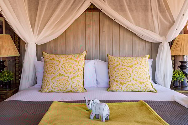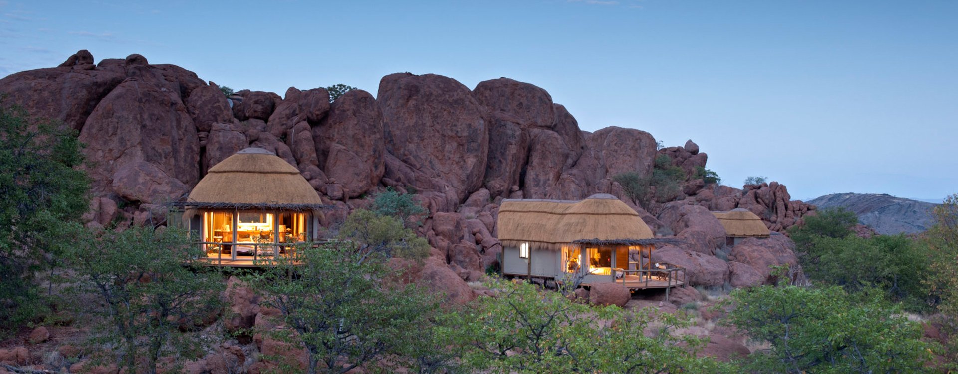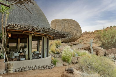 "This masterfully crafted eco-lodge wraps around a high granite koppie, amidst the vast savannah of Damaraland. The safari tents have been built to ensure minimum impact on the environment, and inside they feature comfortable beds, soft cream fabrics, whitewashed floors and stylish en suite bathrooms. Guests can enjoy nature drives searching for desert-adapted elephants. Return in the evenings for sundowners served at a viewing point atop a high boulder."