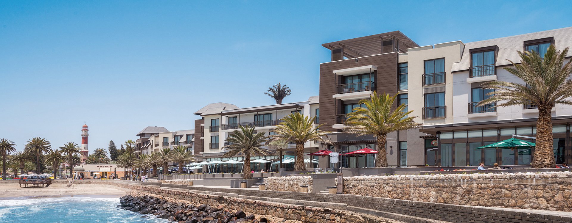 “Uniquely located on the iconic and historic Swakopmund Mole, and surrounded on three sides by the Southern Atlantic Ocean, this property boasts an excellent location and well-appointed rooms. Each one comes equipped with floor-to-ceiling windows, modern amenities and balconies with ocean views. The three restaurants serve Italian, German-Namibian and seafood dishes, there’s a lobby serving drinks and snacks, and the proximity to the beach is excellent.”
