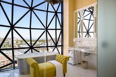 "This hotel in Cape Town, South Africa is a magnet for lovers of contemporary art and design. The Silo Hotel's exterior was designed by London-based architect Thomas Heatherwick, and the interiors by Liz Biden, so expect an eclectic mix of furniture, Egyptian chandeliers, shimmering Persian carpets and bold colours. Outside, the pillowed glass windows send shards of light above the harbour. Facilities include a rooftop pool, bar, library, spa and direct access to the MOCAA."