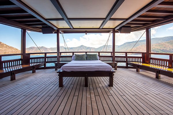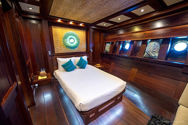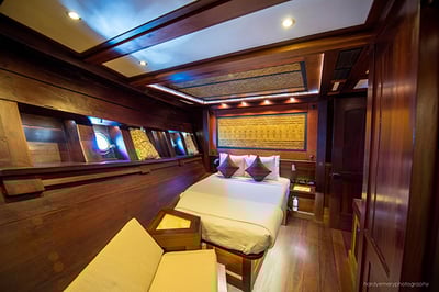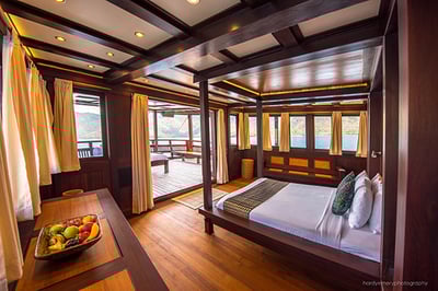 Dunia Baru accommodates up to 14 guests in seven spacious ensuite staterooms, each equipped with independently controlled air-conditioning, state-of-the-art light and sound, and a 32” LED flat-screen television with DVD and satellite. Alongside these modern comforts, guests will discover traditional Indonesian design and exceptional craftsmanship, with floors, fixtures, and furnishings in Javanese teak. A full-beam master suite, located on the upper deck, offers the ultimate onboard luxury, with 190-degree panoramic views and a private sundeck where guests can take in the breathtaking scenery.