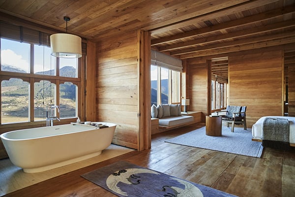 The Phobjikha Valley is, debatably, one of the most visually striking landscapes in Bhutan. The valley itself is wide and glacial, home to the endangered black-necked cranes that migrate here from Tibet between October and February. The Six Senses lodge is perched just above the wetlands, and each room has its own telescope and sweeping views.