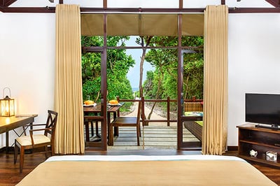 Jungle Beach Resort in Sri Lanka is the ultimate in seclusion. Here you can sleep in a jungle-wrapped cabin and step out onto a wild sweep of beach that’s almost entirely deserted. Accommodation varies between standard resort-style lagoon-view rooms to cabins – we recommend the cabins which feature all modern amenities alongside outdoor showers and private terraces. No rooms interconnect but the cluster of three cabins sharing a pool would work for families with older children or an extended group.
