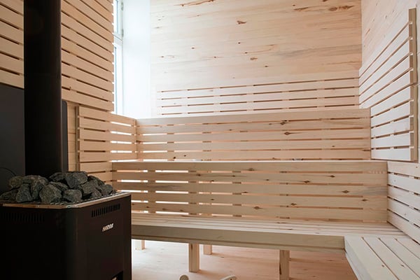 Fogo Island Inn offers 10 different room styles for all types of guests visiting that range from 32 to 62 square meters in size. With expansive floor-to-ceiling windows, each room specializes in its own unique view of the Northern Atlantic Ocean that includes a king-sized bed and walk-in shower. Fogo Island Inn Suites offer more exclusive features such as a loft-style bedroom, freestanding bathtub, and wood stove. Room 29, also referred to as the Flat Earth Suite, is a two-storey, 102 square meter suite that provides commanding views of the north, east, and south which also features a sitting area and lofted sleeping quarter that includes a walk-in shower, soaker tub, wood stove, and extra washroom.