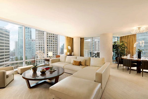 Shangri-La Vancouver offers 119 luxury hotel rooms and suites, ranging in size from 450 square feet to 1395 square feet. Many come with their own balconies to take in the sweeping views of the city, mountains, and harbor. All accommodations are tastefully decorated in a contemporary style with a distinct Asian influence, contrasted with sleek B&B Italia furniture. Floor-to-ceiling windows provide ample natural light and cast a golden glow on the warm tones and golden hues of the elegant décor. All rooms are wired for connectivity and sound and feature a 42” flat-screen TV, CD/DVD player with stereo surround sound, iPod docking station, and complimentary WiFi. Bathrooms are outfitted in Italian marble and feature a separate glass-enclosed shower, soaker tub, and granite vanities with recessed sinks.