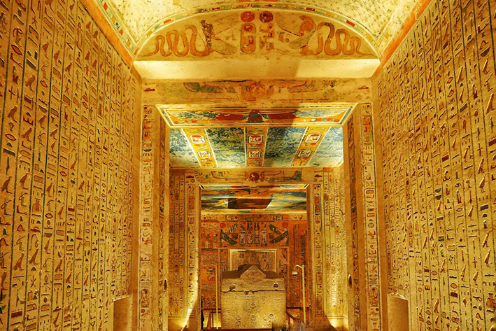The following morning we pass lush sugar cane fields en route to the arid desert mountains of the Valley of the Kings. Roads snake through red limestone hills until we reach the vast desert tomb complex where Egypt’s pharaohs were buried in individual and magnificent tombs. It’s a special moment to stand alongside the current Lord Carnarvon nearly a century after his great-grandfather and the British archaeologist Howard Carter unearthed King Tutankhamun’s tomb.